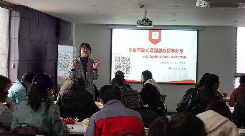 汤琳老师以校级课程思政示范课程《数据结构与算法》为例,结合生动有效的互动工具和技巧,从课前、课中和课后三个教学环节分享了课程思政融入的思路和途径,在教学全过程中体现课程思政,提升教师课堂教学能力和教学效果。其中重点讲解了该门课程的思政元素融入案例,强调了专业教育和思政教育有机融合,让课程思政教育的价值引领有高度,专业知识有深度,能力培养有广度,真正做到思政内容进课堂、进头脑,构建“全员、全程、全方位”的三全育人大格局。