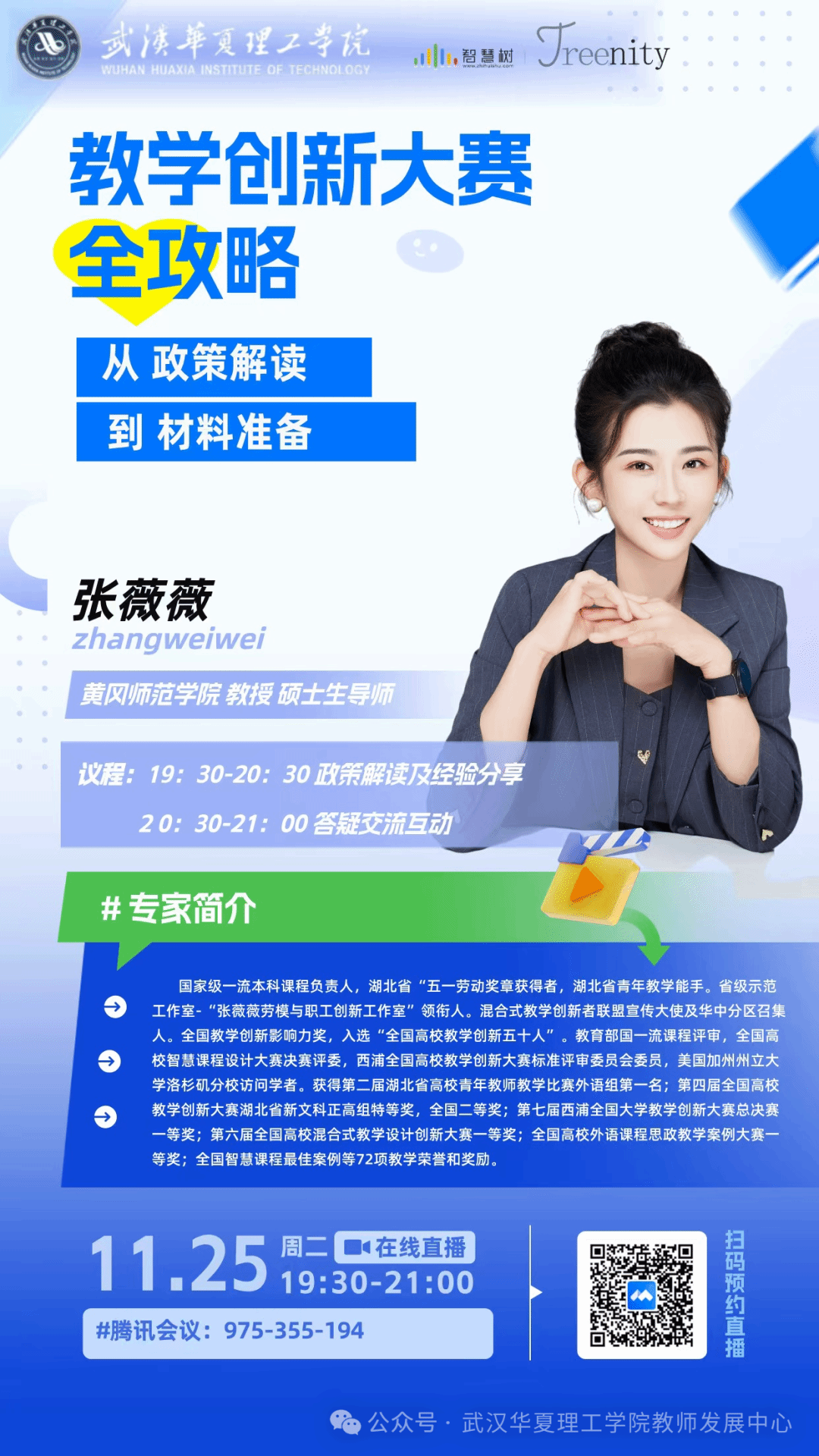 为深入推进教学改革创新,助力教师备战新一届高校教学创新大赛,2025年11月25日,武汉华夏理工学院联合智慧树平台,特邀国家级一流课程负责人、第四届全国高校教学创新大赛湖北省新文科正高组特等奖获得者张薇薇教授,举办了一场高水平的赛事专题培训会。副校长李猜、教务部部长杨易出席培训会并发表讲话,各学院80余名骨干教师齐聚云端,共享这场教学创新的思想盛宴。