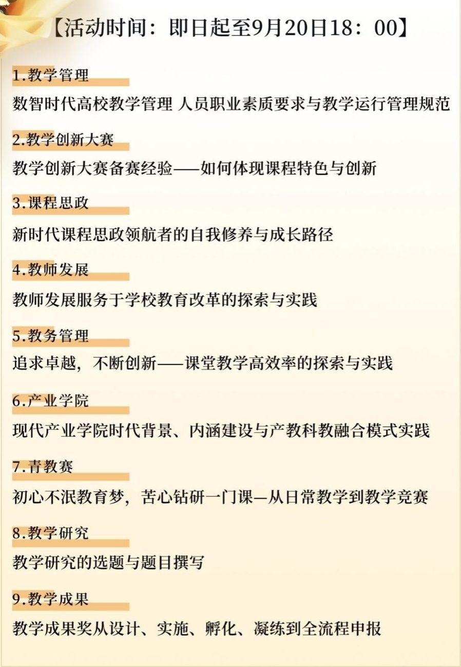 人力资源部教师发展中心联合卓越国培推出公益课系列活动,课程涵盖教学管理、教学创新大赛、课程思政、教师发展、教务管理、产业学院、青教赛、教学研究和教学成果9个方面,助力教师们的个人成长与发展,以此向辛勤耕耘在教育一线的教师们致以崇高的敬意!