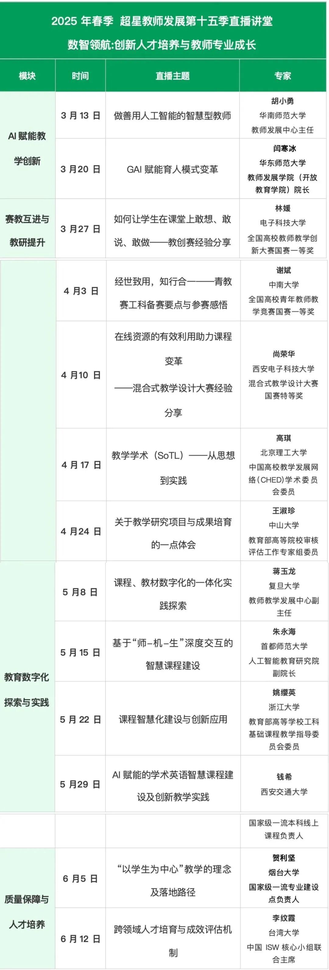 2025 年春季学期,超星教师发展中心推出第十五季直播讲堂,本次系列直播将围 绕 “ 数智领航:创新人才培养与教师专业成长” 这一主题展开,旨在通过多元化的模块和主题,分享先进教学理念与教学方法,助力教师在数智时代的专业发展与教学创新,培养创新型人才。将邀请教学领域行业专家、教学创新先行者、教学竞赛获奖者以及教学质量保障专家等,从人工赋能教学创新、赛教互进与教研提升、教育数字化探索与实践、质量保障与人才培养等方面分享真知灼见,传播宝贵教学实践与教学改革经验。