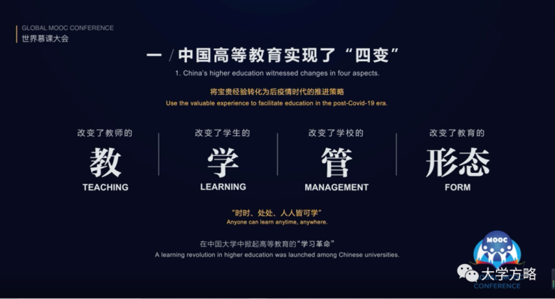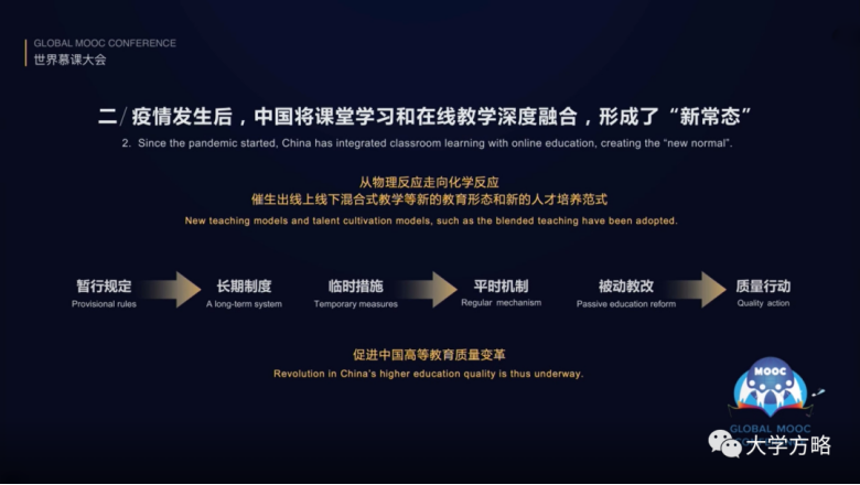 2019年的中国慕课大会以“识变、应变、求变”为主题,回顾和总结了在新一轮科技革命和产业变革浪潮的大背景下,以慕课为代表的教育新形态正在深刻改变中国高等教育的理念、经验和模式,得到了来自联合国教科文组织、全球高校与在线教育平台等机构的高度肯定和认可。