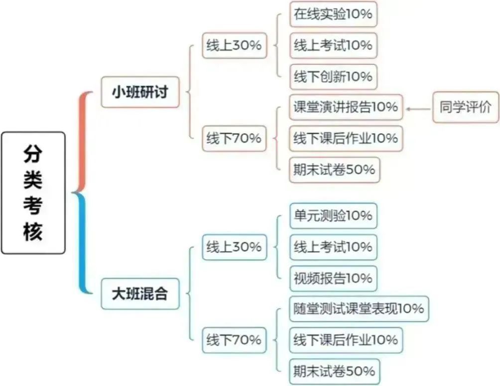 深化过程性评价体系改革。建立集知识技能、过程方法、思政态度等多维度多元评价考核体系,无论小班研讨还是大班混合,期末试卷都占50%,其余50%包括线上测试、线下创新、课堂翻转、课后报告等过程性多元化考核。