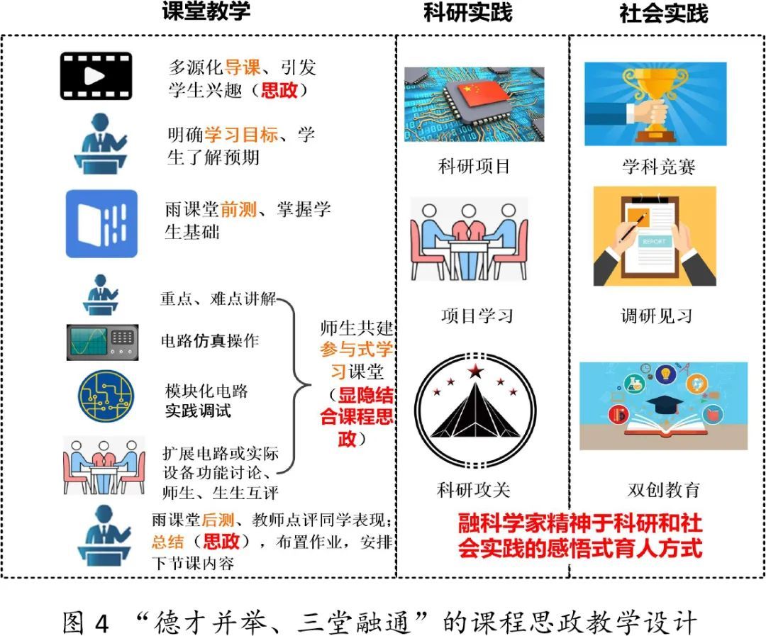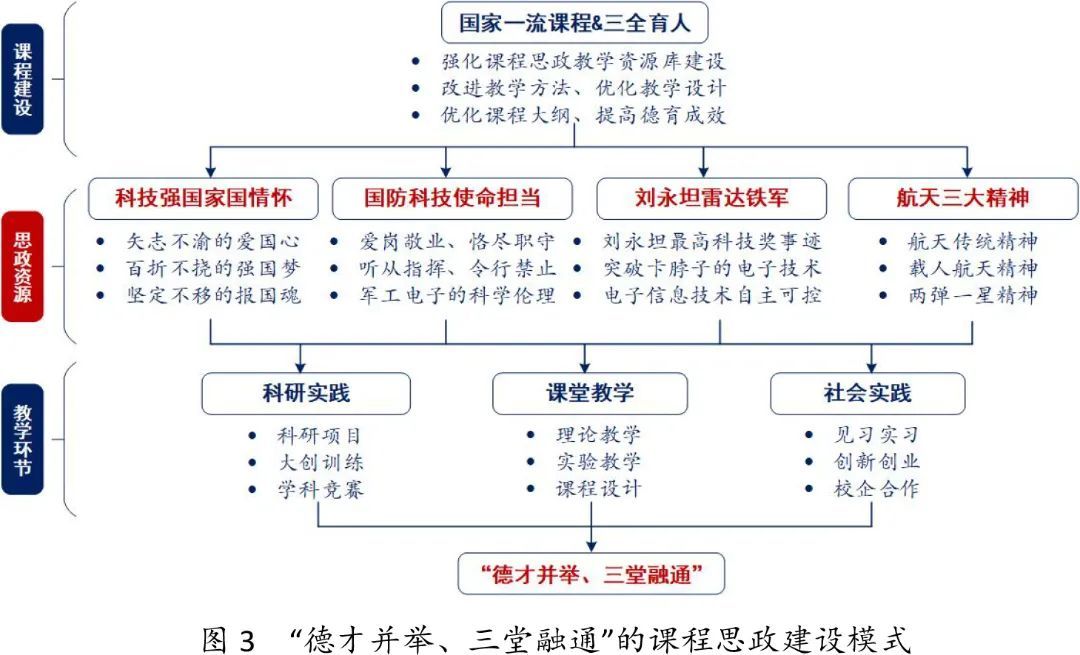 以实践“课堂教学-科研实践-社会实践”三堂融通,突出“国防科技使命担当和航天强国家国情怀”,依托“国家科技最高奖刘永坦院士雷达铁军先进事迹和航天三大精神”,以国家级一流课程为载体,开展通信电子线路课程的思政教学资源库建设,改进教学方法和教学设计,优化课程大纲,厚植理想信念沃土,使矢志不渝的爱国心、百折不挠的强国梦、坚定不移的报国魂扎根每个学生心中。